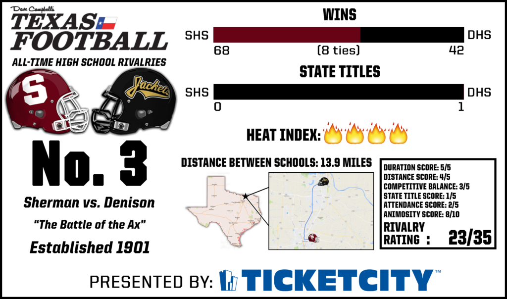 Greatest game ever? Denison wins 44-43 in 2007. Denison was down 43-24 going to the fourth quarter, scored three times, stopped a fourth-and-inches attempt in its territory and then blocked a 40-yard field goal attempt in the final seconds. In 1995, both teams came in state-ranked and Denison won a 16-7 slugfest in a mud bowl at Sherman.