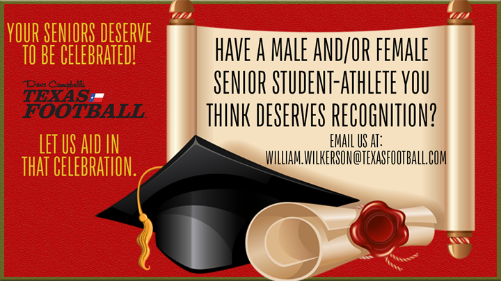 We want to celebrate senior student-athletes across the state of Texas who have had their seasons cut short due to the Coronavirus pandemic! Have a male or female student-athlete you think deserves recognition? Email us at william.wilkerson@texasfootball.com with a bit about what makes them so special, including on-field and classroom accomplishments and pictures!