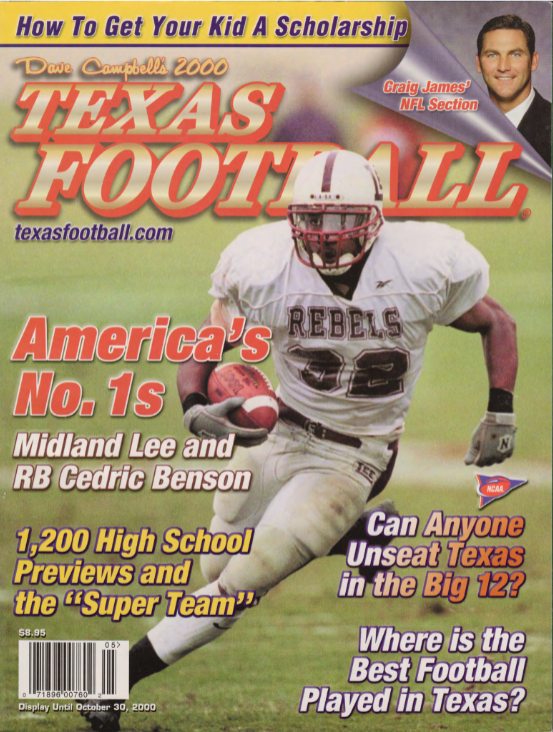 My favorite is the 2000 cover of Cedric Benson, its a great action shot of Benson coming downhill at DKR Memorial Stadium as he led Midland Lee to the second of three straight titles on his future college homefield. He's playing on natural grass, so there's grass stains on his jersey and he's running right at you. Plus its the only HS only main cover in the magazine's history.