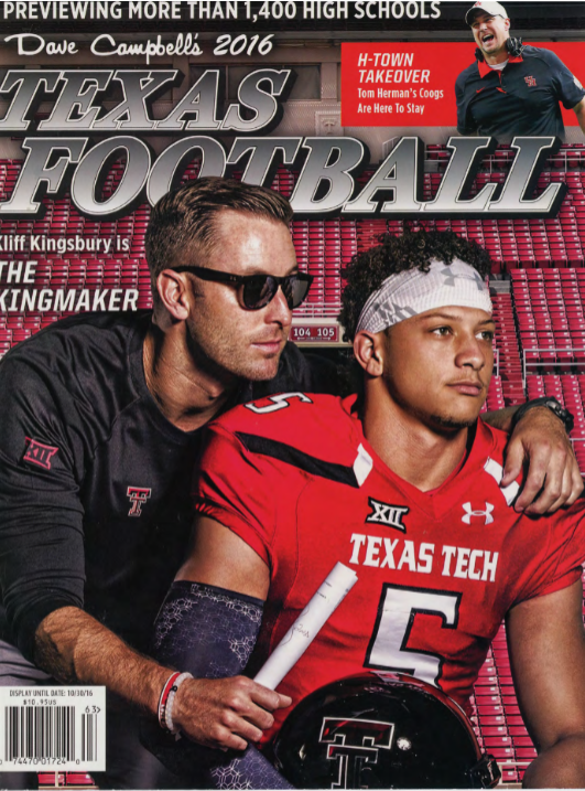 2016 cover with Mahomes, Kingsbury. An ode to the past that ended up becoming more iconic because Mahomes is on his way to becoming the best QB in NFL history. Kingsbury is a GQ model so that explains itself. An added bonus is the the gatefold cover of Todd Dodge and Sam Ehlinger in that same issue.