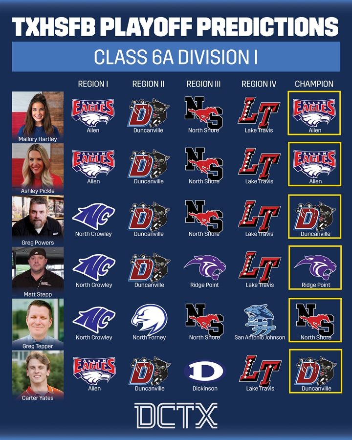 Predictions for the 2025 UIL Texas High School Football Playoffs, including state championship winners like the Allen Eagles, Duncanville Panthers, and Galena Park North Shore Mustangs.