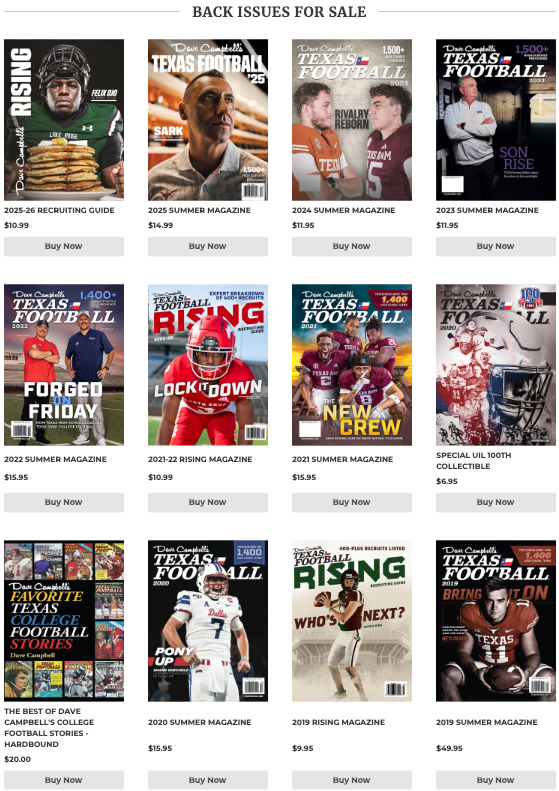 Did you know that you can order back issues of our magazine on TexasFootball.com? Just go to our STORE and search through all of our old magazines to find your favorite! We'll ship it to you.