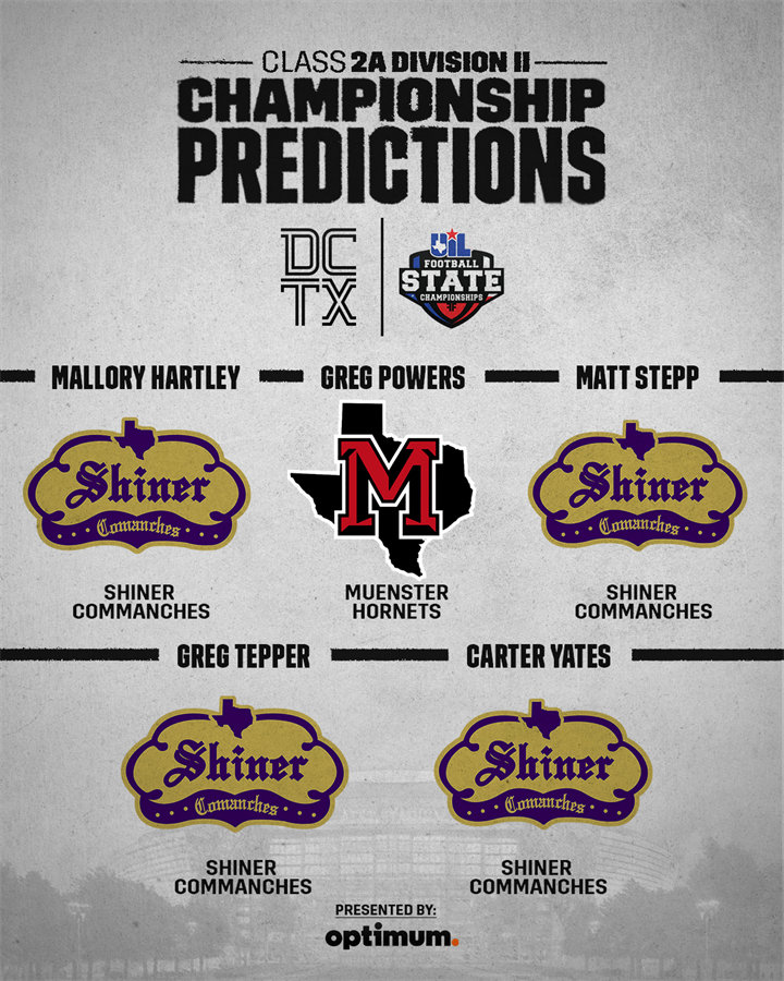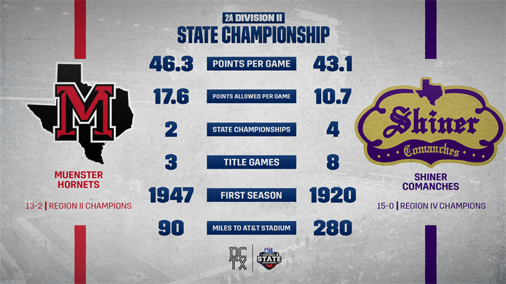 Muenster (13-2) vs. Shiner (15-0), 11 a.m. Thursday at Arlington’s AT&T Stadium