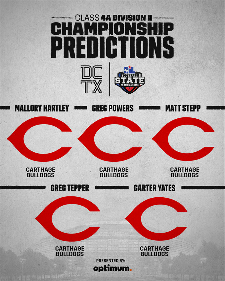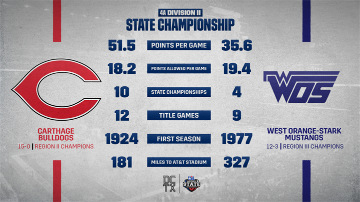 It’s a battle of storied programs as Carthage, which holds a 31-game winning streak, seeks their second straight title and 11th crown in school history as they take on surprising West Orange-Stark, which is playing in their ninth title game and first since 2017.
