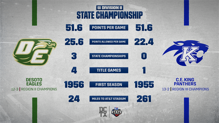 DeSoto (12-3) vs. Sheldon King (13-2), 7 p.m. Saturday at Arlington’s AT&T Stadium