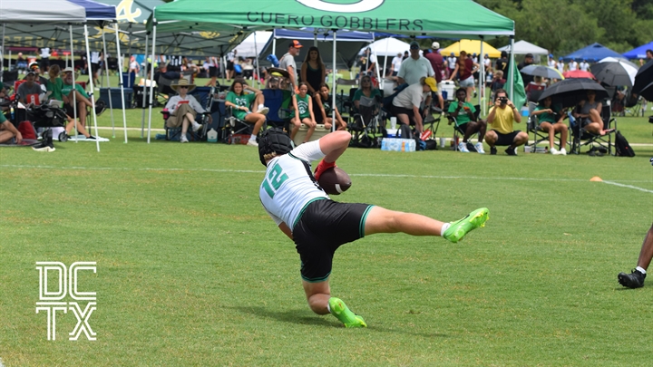 Cuero 2026 WR Walker Dietze (6-2, 185) had 31 catches through three games of pool play, 13 of which were a touchdown or two-point conversion. He showed off technical route running and jump-ball ability (he high-pointed a post over two defenders). Dietze finished last season with 1,231 yards and 19 touchdowns, earning First Team All-State honors. This season, he will play both ways as a wide receiver and cornerback. Dietze has improved his 40-yards dash time to a 4.62, which was one of the few questions about his projection to the DI level. While offerless as of now, he is on the radar of in state schools like UTEP, TCU, Baylor, Rice and UTRGV. (Yates)