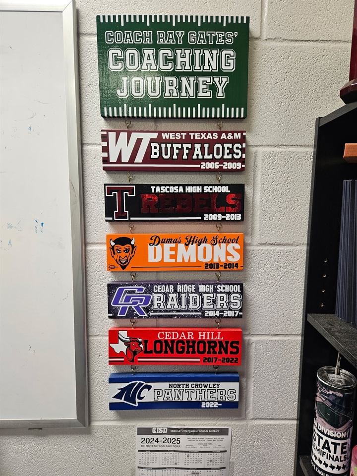 The truth is, he hadn’t. Gates has a big-city personality. But at his core, he’s a small-town country boy from Shiner, whose entire population of 2,163 people is smaller than North Crowley’s enrollment of 2,933. Four years ago, Gates wasn’t even familiar with the area he’s come to embody. His emotion and conviction come from knowing God called him to North Crowley. The wall art is a reminder of all the other places God brought him first, how each stop prepared him for this moment. His entire life has been a battle between his will and God’s. The wall art is a scoreboard showing that God prevailed. Gates is so thankful He did.